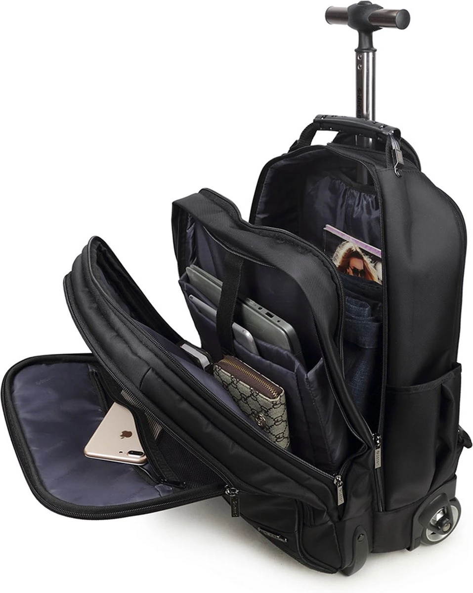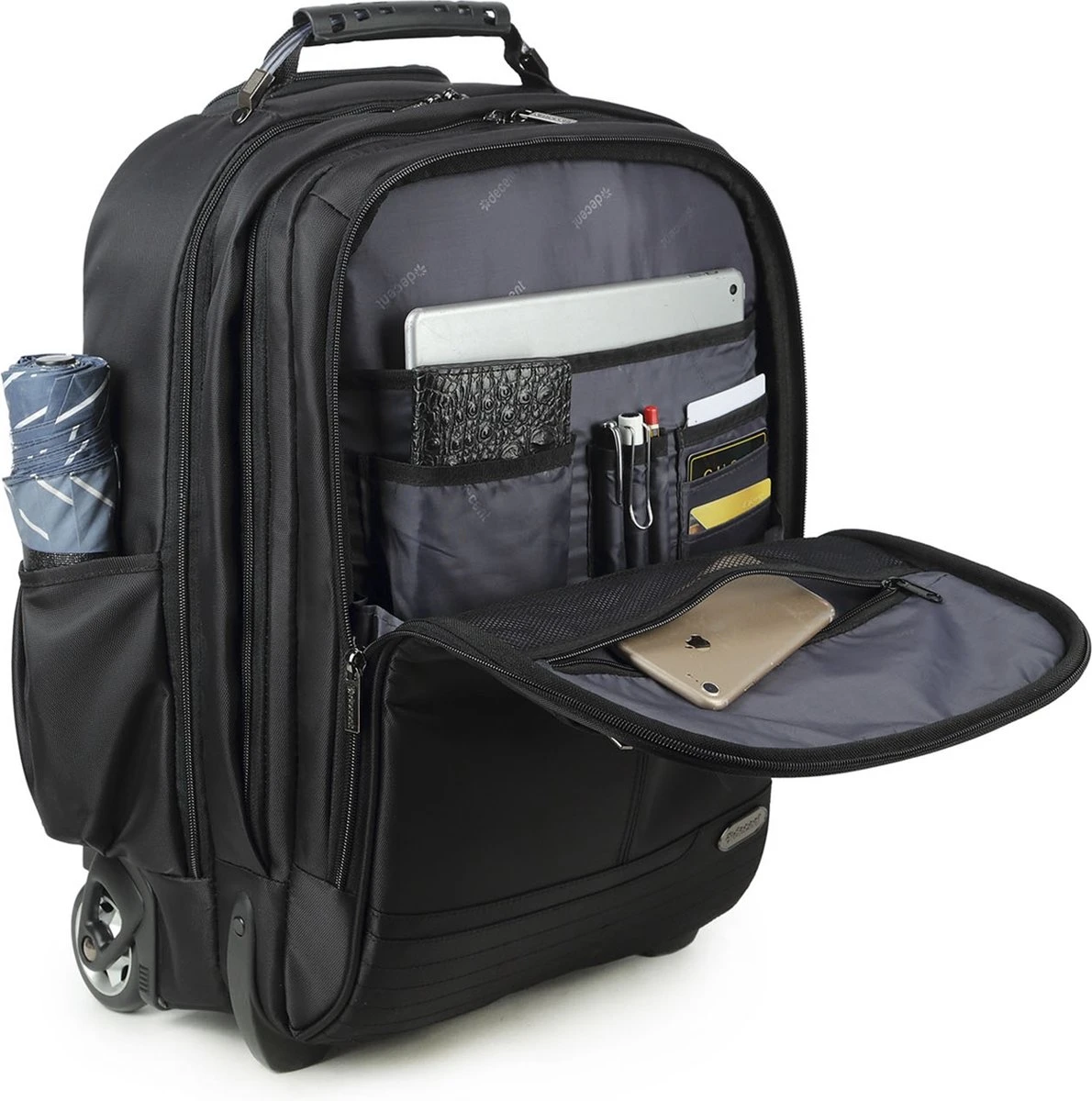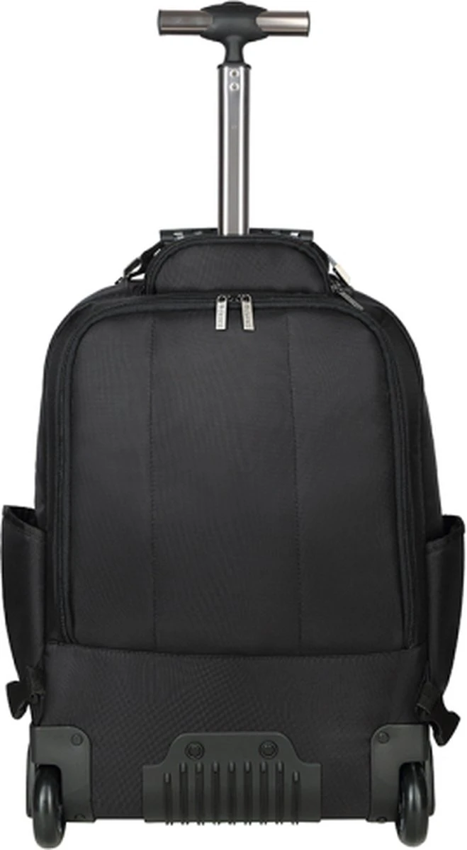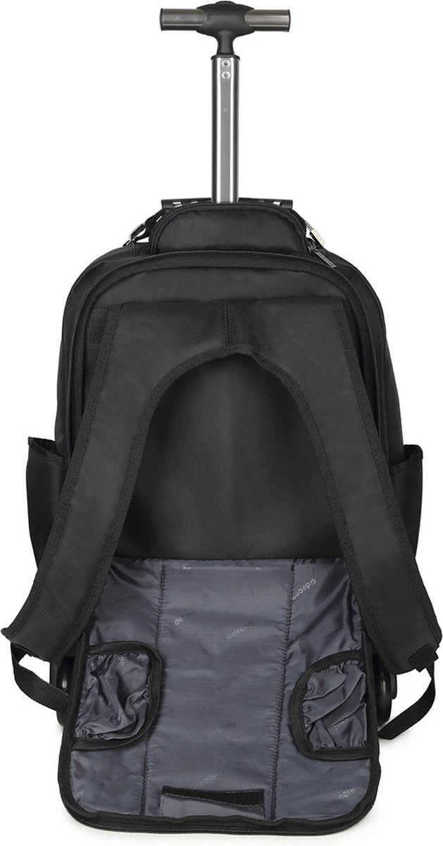 Een extra ritsvak helemaal op de voorzijde is handig voor bijv. je telefoon of papieren die je snel bij de hand wil hebben. Op beide zijkanten zit een insteekvak voor een drinkfles of paraplu. Met het handvat op de bovenkant kun je de rugzak snel en makkelijk oppakken. De 2 wielen, verstelbare mono-tube trekstang en 2 verstelbare, gewatteerderde schouderbanden zorgen voor optimaal reiscomfort.