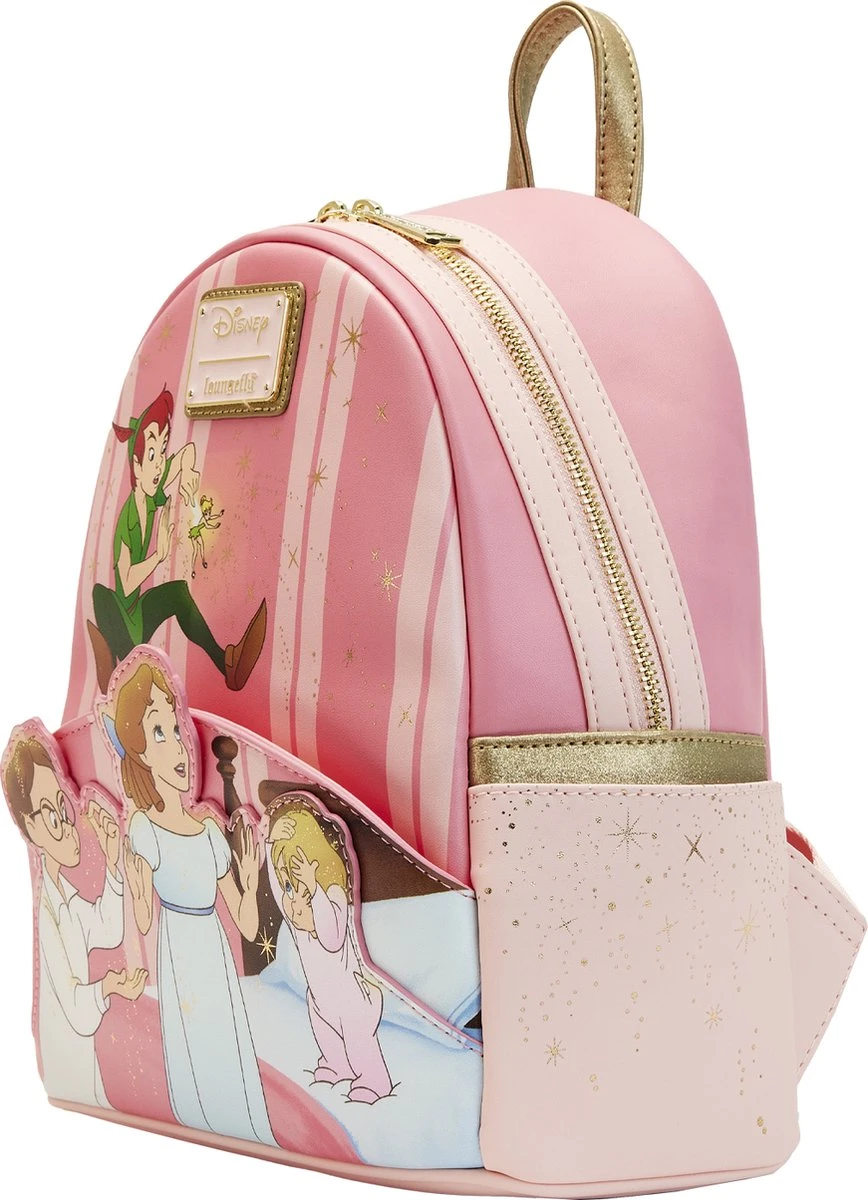 Rugtas Peter Pan You Can Fly. Geweldige kunstlederen tas uit de Disney-collectie van het Amerikaanse designermerk Loungefly. De tas wordt uitgebracht t.g.v. de 70ste verjaardag van de Disney-klassieker Peter Pan. De print op de tas is geïnspireerd op een populaire scene uit de film. Peter heeft Tinker Bell vastgepakt en schudt haar zachtjes heen-en-weer, zodat er sterrenstof neerdwarrelt op Wendy, John en Michael. Door de werking van de sterrenstof kan het drietal meevliegen naar Nooitgedachtland. Op de achterzijde van de tas strooit Michael ook wat sterrenstof uit over Nana, de hond van de familie Darling. De tas heeft een voorvakje met ritssluiting. De tas is voorzien van twee verstelbare schouderbanden en een bijpassende binnenvoering.