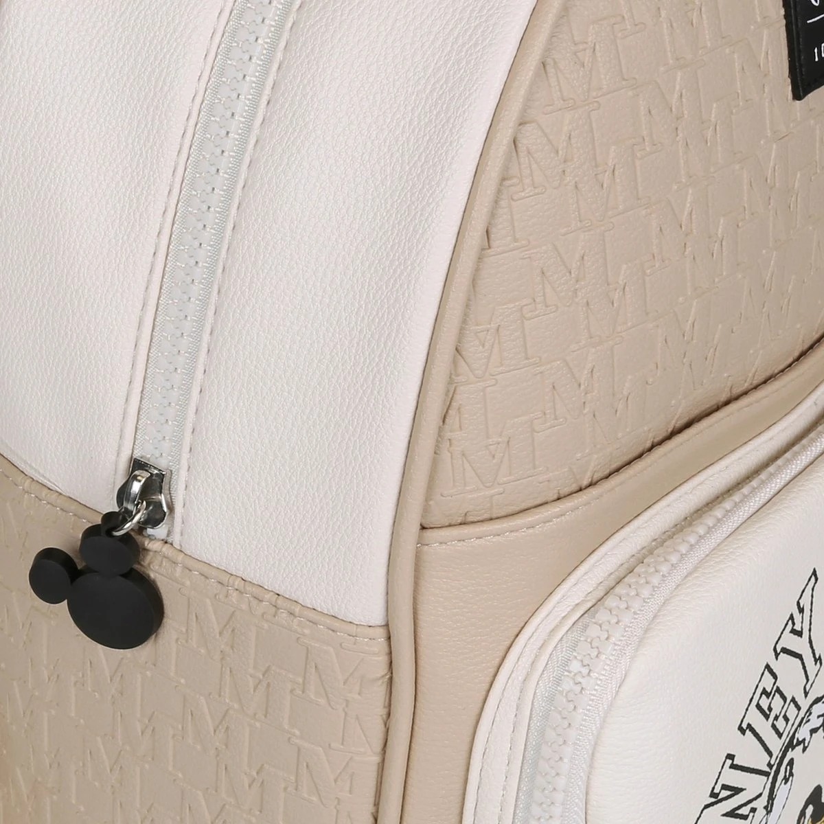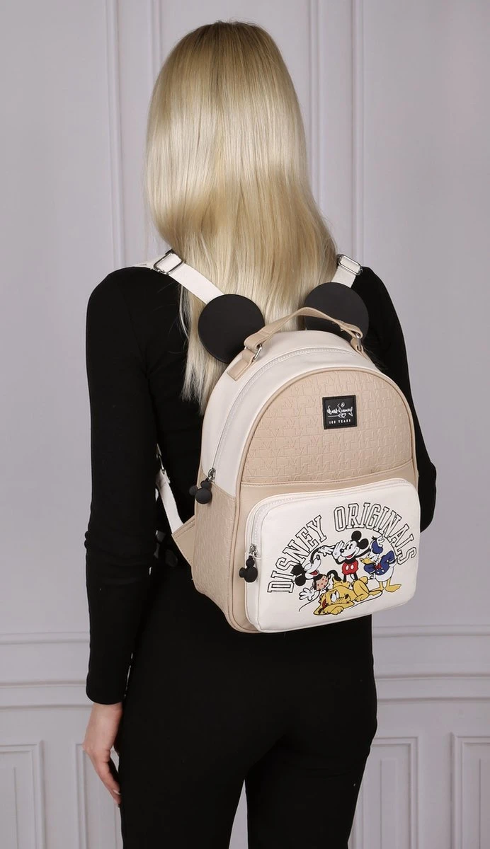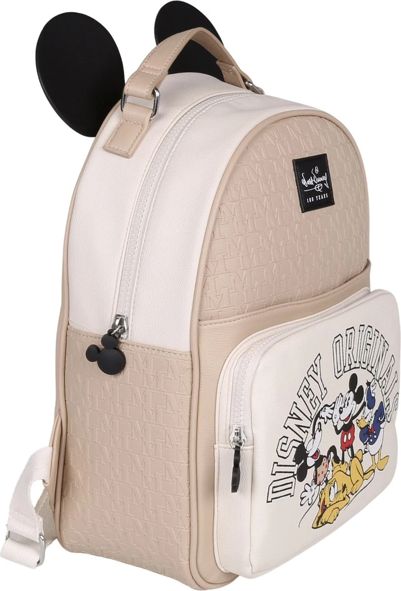Beige rugzak van imitatieleer, bedrukt met afbeeldingen van Mickey Mouse and Friends. In de grote kamer en aan de voorkant is er een klein vak met ritssluiting en een open vak, ideaal voor handige spullen. Zachte, verstelbare bandjes op de rug om de schouders en rug te beschermen tegen te zwaar tillen, handvat bovenaan. Perfect om alle meest noodzakelijke dingen in op te bergen, maar niet geschikt voor A4. Hoogte: 32 cm, Breedte: 24 cm, Diepte: 11 cm Op onze andere advertenties vind je een bijpassende reistas in hetzelfde patroon.