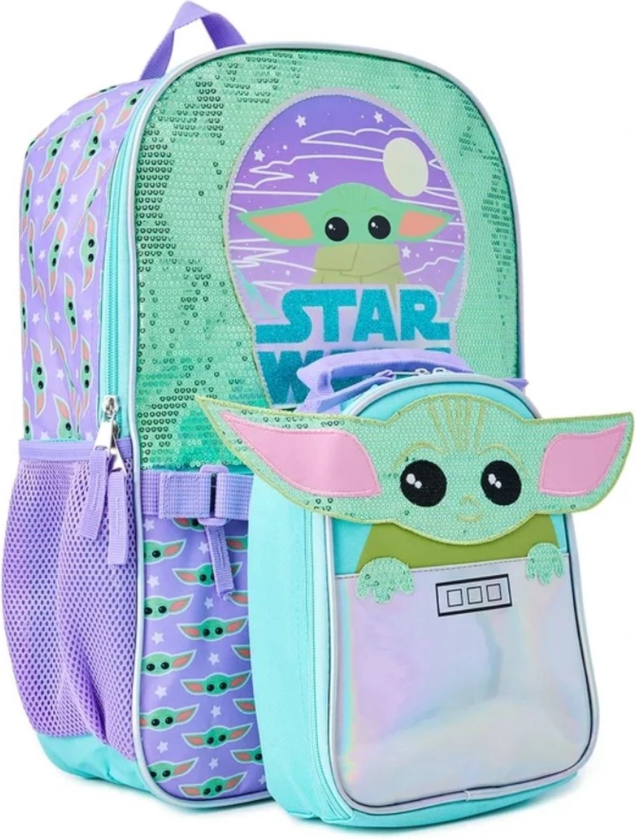 Met deze glitter en glamour Star Wars Baby Yoda rugtas steelt jouw kind de show. Deze rugtas is verstelbaar en tweedelig, inclusief een lunchtas, afneembaar (makkelijk los te maken) voor extra opbergruimte en aan de zijkanten kunnen bekers opgeborgen worden. De rugtas en lunchtas zijn voorzien van glitter pailletten voor een shiny look. De kleur is zacht paars met zacht groen. Met deze rugtas ben jij uniek en scoor je een echte eyecatcher!