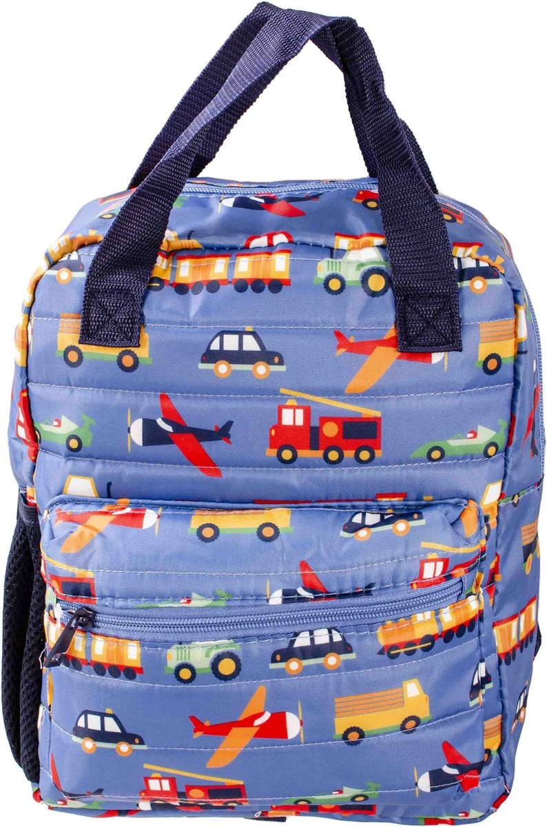 Superleuk blauw rugzak voor de eerste schooljaren vol met toffe vliegtuigen, vrachtwagens en brandweerauto’s!