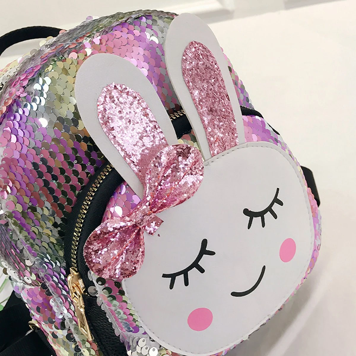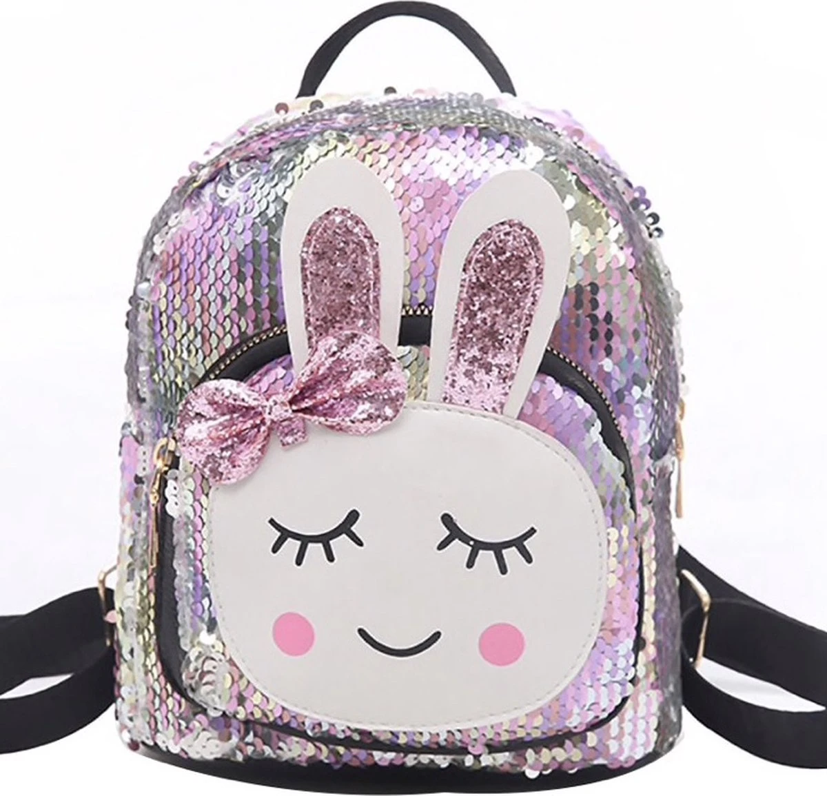 De gehele rugtas, behalve de achterkant is versierd met mooie zilver/roze pailletten. Op het voorvakje is een heel lief konijntje bevestigd.