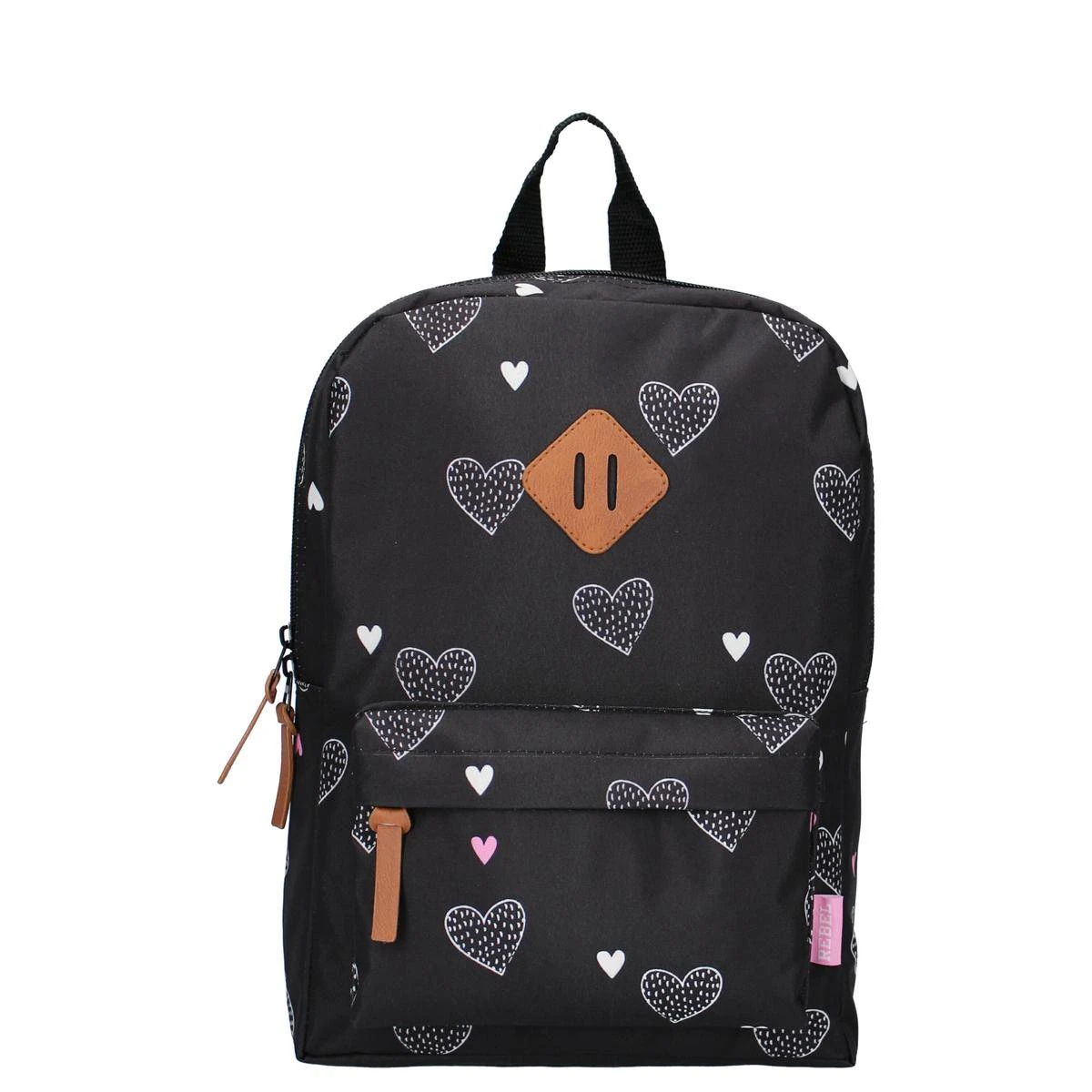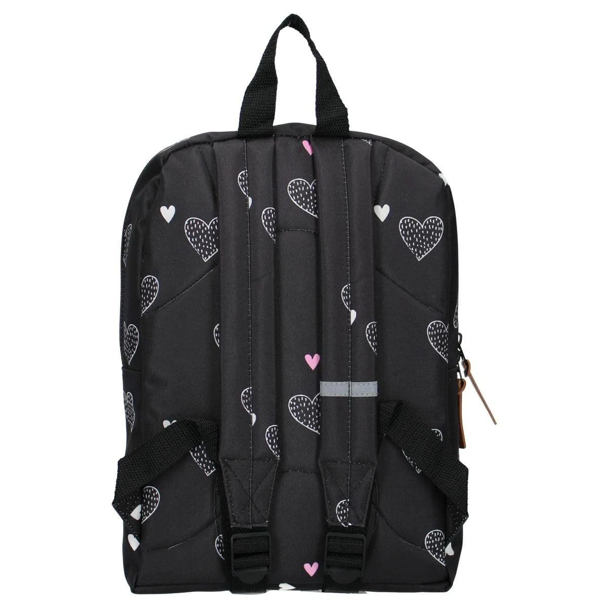 Deze rugzak uit Milky Kiss Hearts collectie heeft een eenvoudig zwart/witte hartjes dessin. Het hoofdvak biedt voldoende ruimte voor alle spullen voor een dagje school of tijdens een dagje op pad. De rugzak heeft een verstevigd rugpand en een met rits af te sluiten voorvakje. De gefoamde schouderbanden zijn in lengte verstelbaar en dragen hierdoor altijd comfortabel. De cognackleurige vegan leather ritspullers en details zorgen voor een extra luxueuze uitstraling.