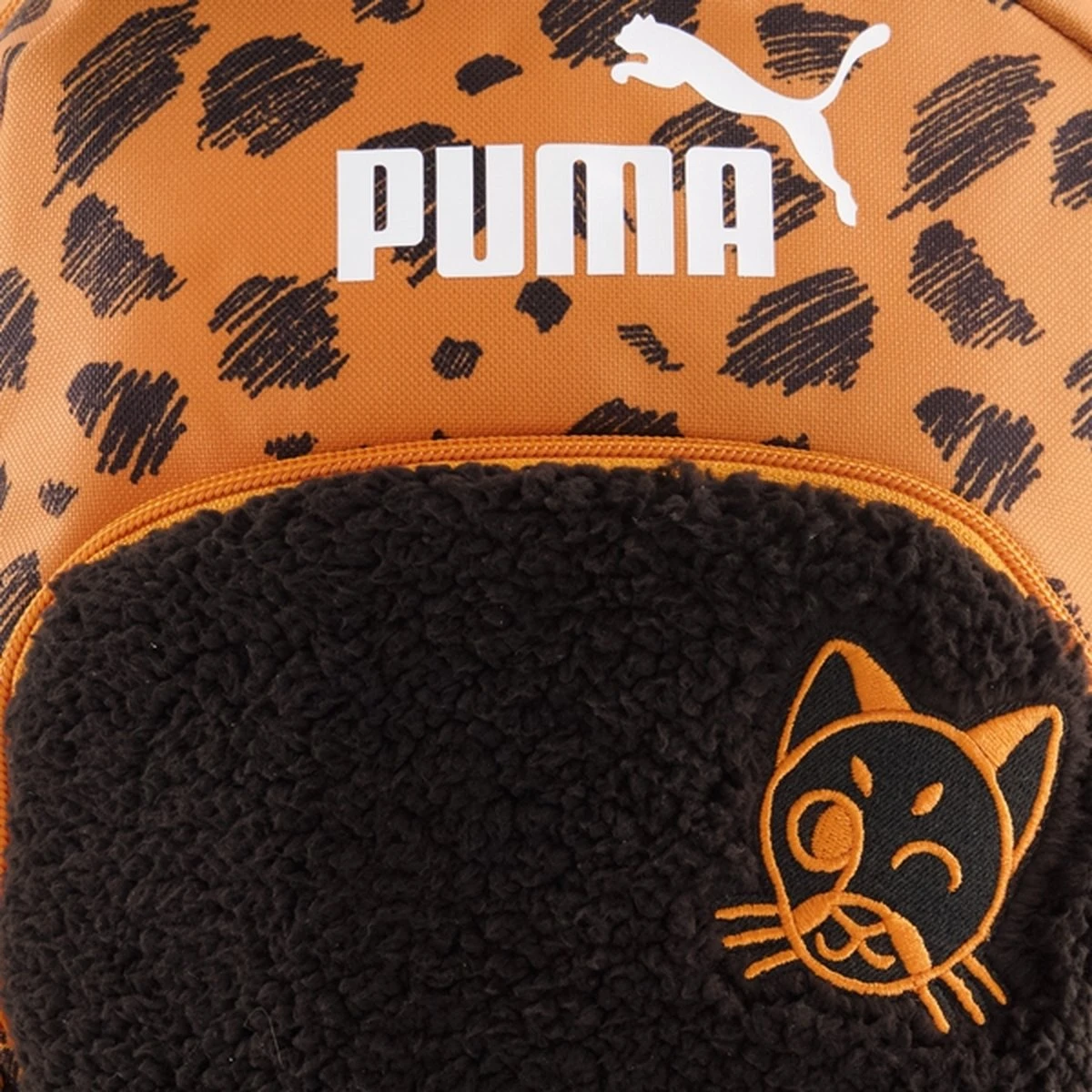 Bruine Puma Pu Mate rugtas voor kinderen. Voorzien van een handgreep aan de bovenzijde en twee gewatteerde, verstelbare draagbanden met een borstriem. Deze mooie tas wordt versierd met een all over panterprint, een voorvak met schapenvacht met daarop een vrolijke afdruk van een panter. Het voorvak heeft een ritssluiting. Verder heeft de rugtas een hoofdvak met een dubbelzijdige ritssluiting en twee mesh vakken met elastische bindingen aan de zijkanten. Gemaakt van 100% polyester. Afmetingen: 25,5 x 33,5 x 13,5 cm. De inhoud is 12 liter.