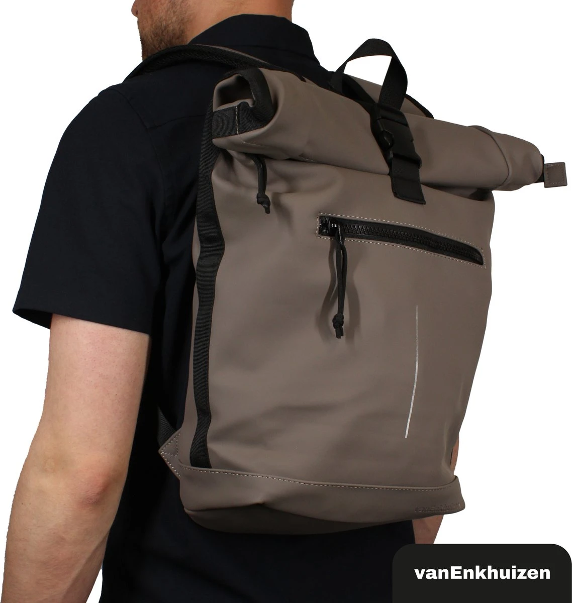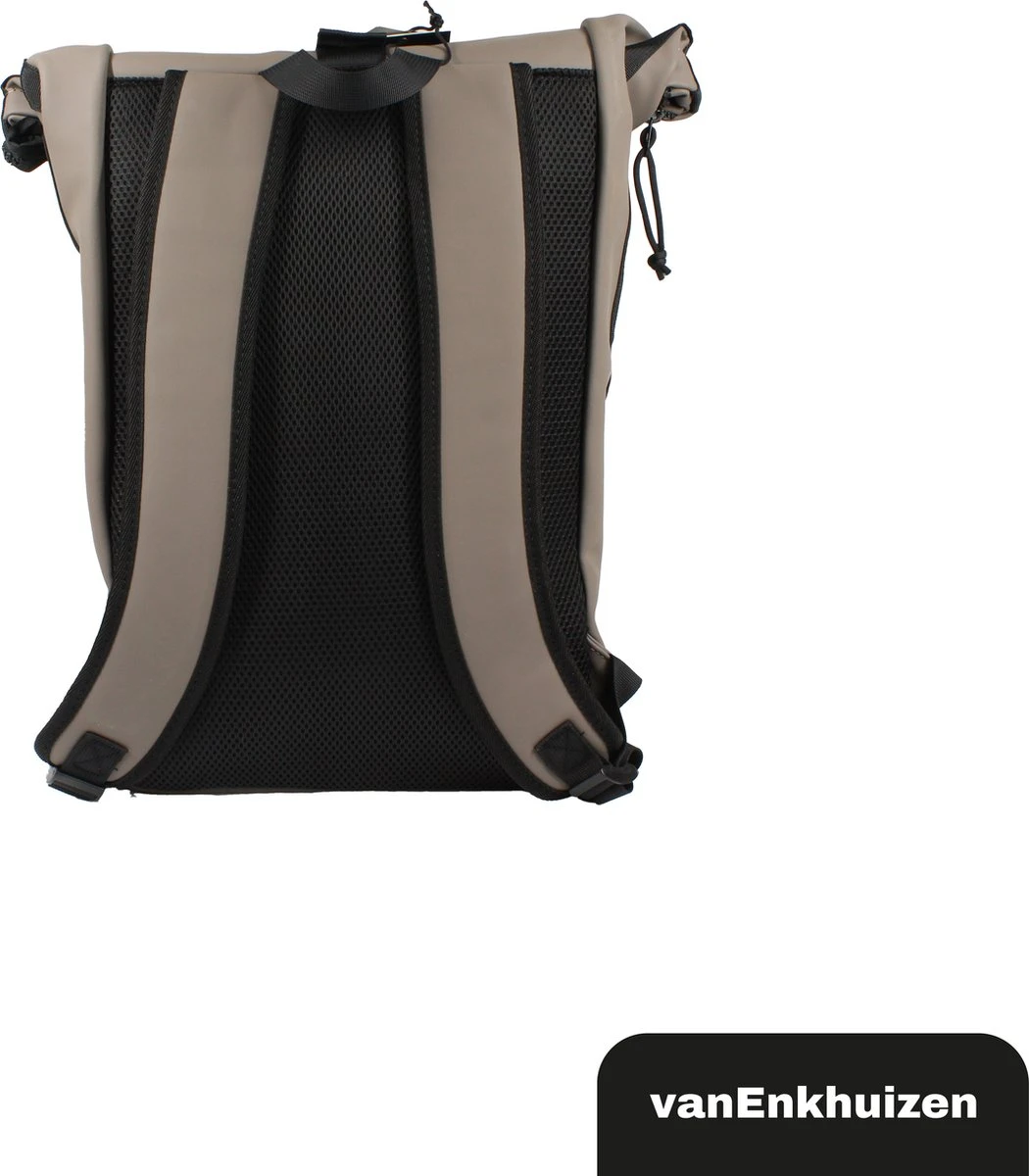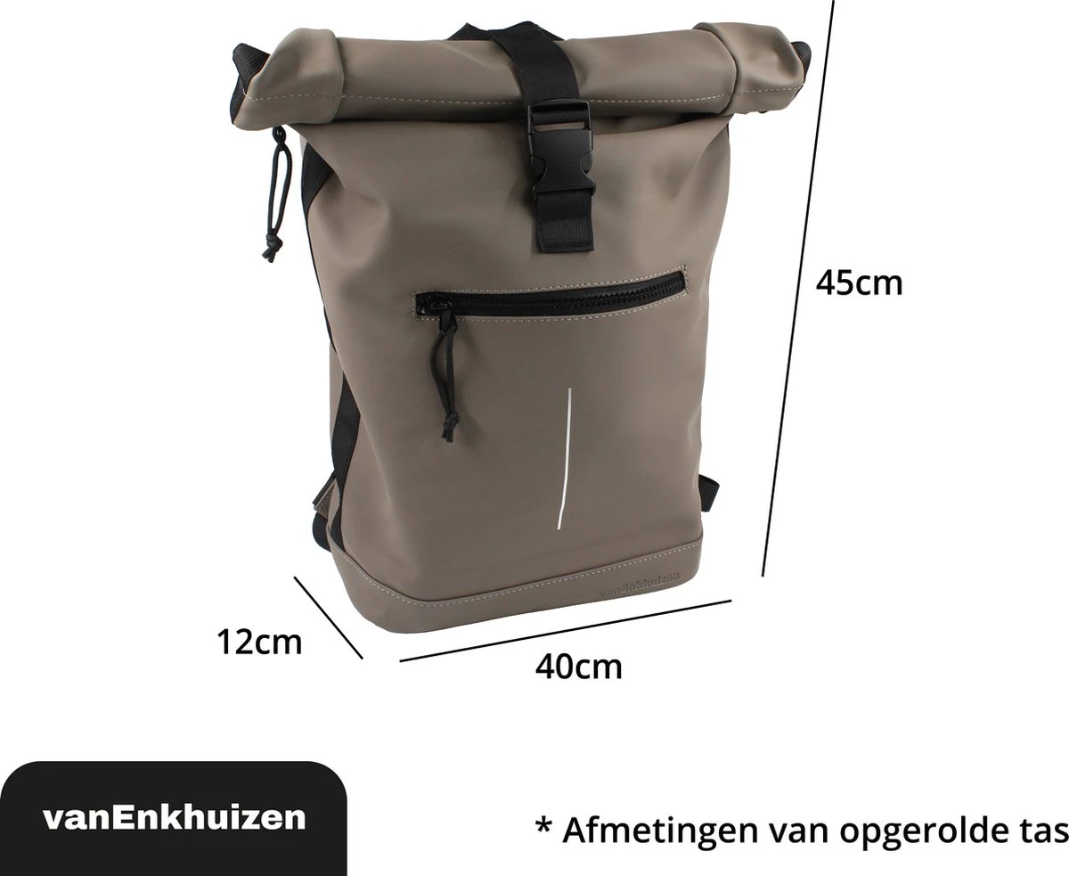 Neem je spullen overal mee naartoe in deze stijlvolle van Enkhuizen Rolltop Rugzak voor dames en heren. Maak de rugtas groter en kleiner door de sluiting op of uit te rollen. Het laptopvak biedt ruimte aan een 15,6 inch laptop, die droog blijft via het waterafstotende Tarpaulin. Houd je spullen warm of koud dankzij de thermo binnenzijde en gebruik de ritsvakken om kleine spullen weg te stoppen. Veilig de weg op in het donker is geen probleem door de reflectie strip op de rugzak. De gewatteerde schouderbanden zorgen voor ideaal draagcomfort, waardoor deze handige tas onmisbaar wordt.