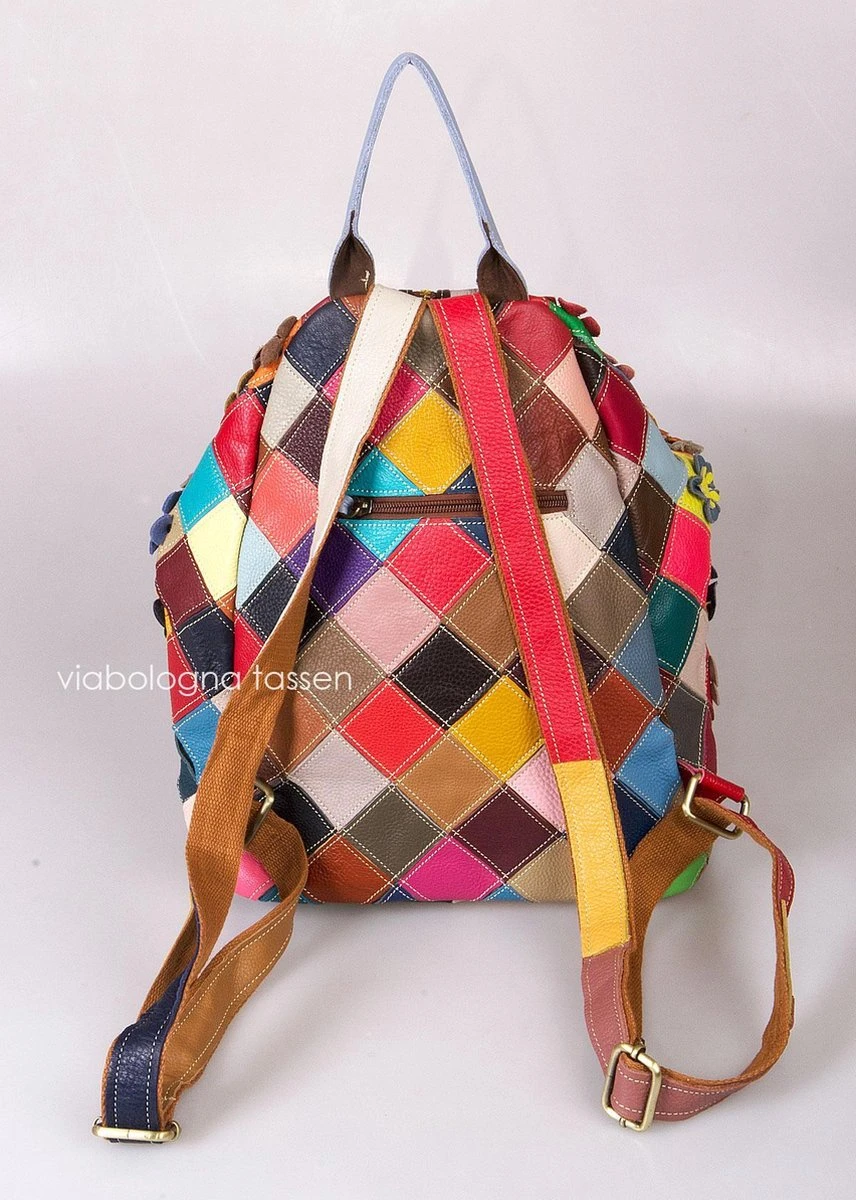 De lederen gekleurde patchwork rugtas is lekker ruim en sluit met een stevige rits en clipsluiting. Aan de binnenkant wat vakjes waaronder een met rits.