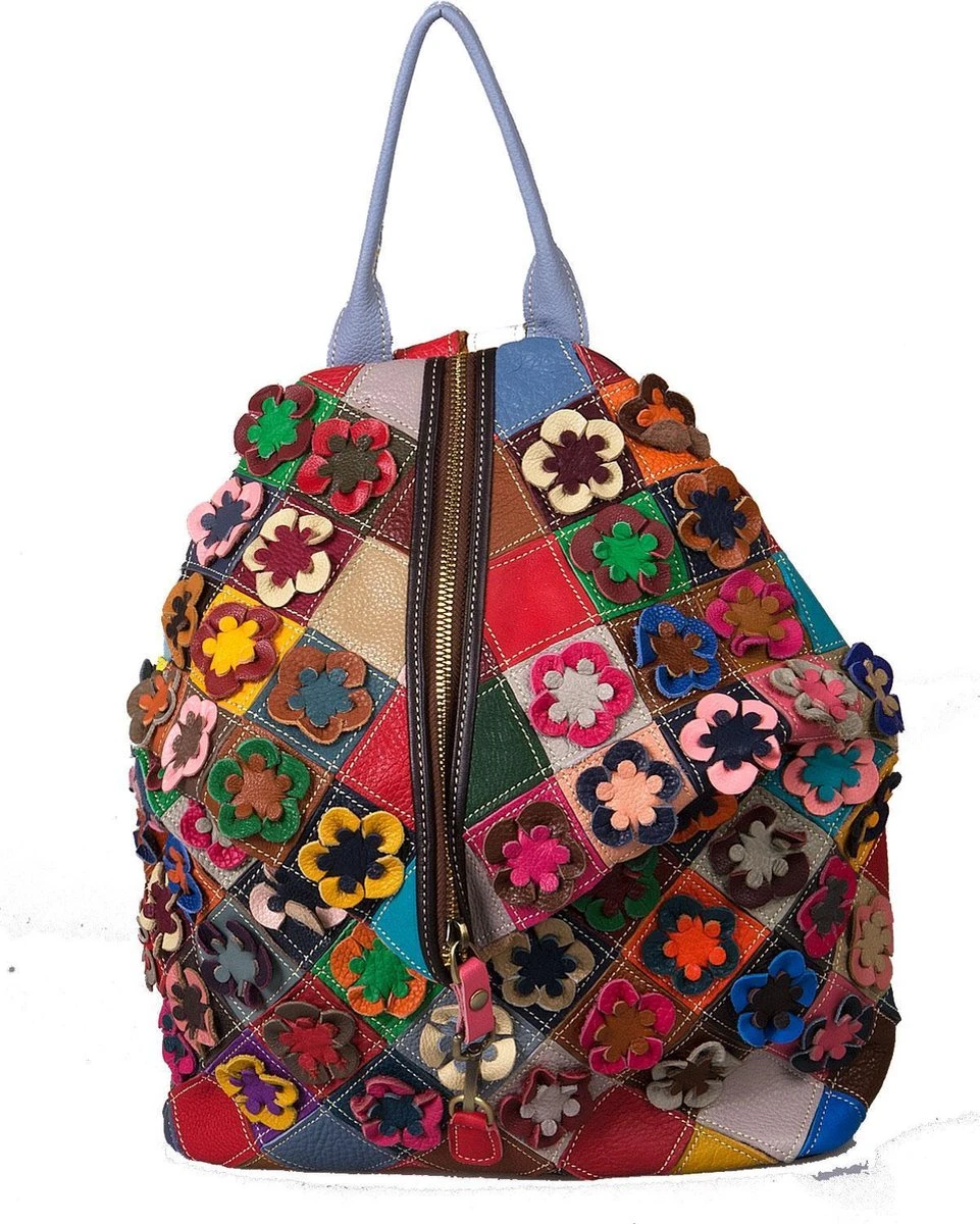 Vrolijke patchwork gevlochten leren rugzak in Ibiza stijl.