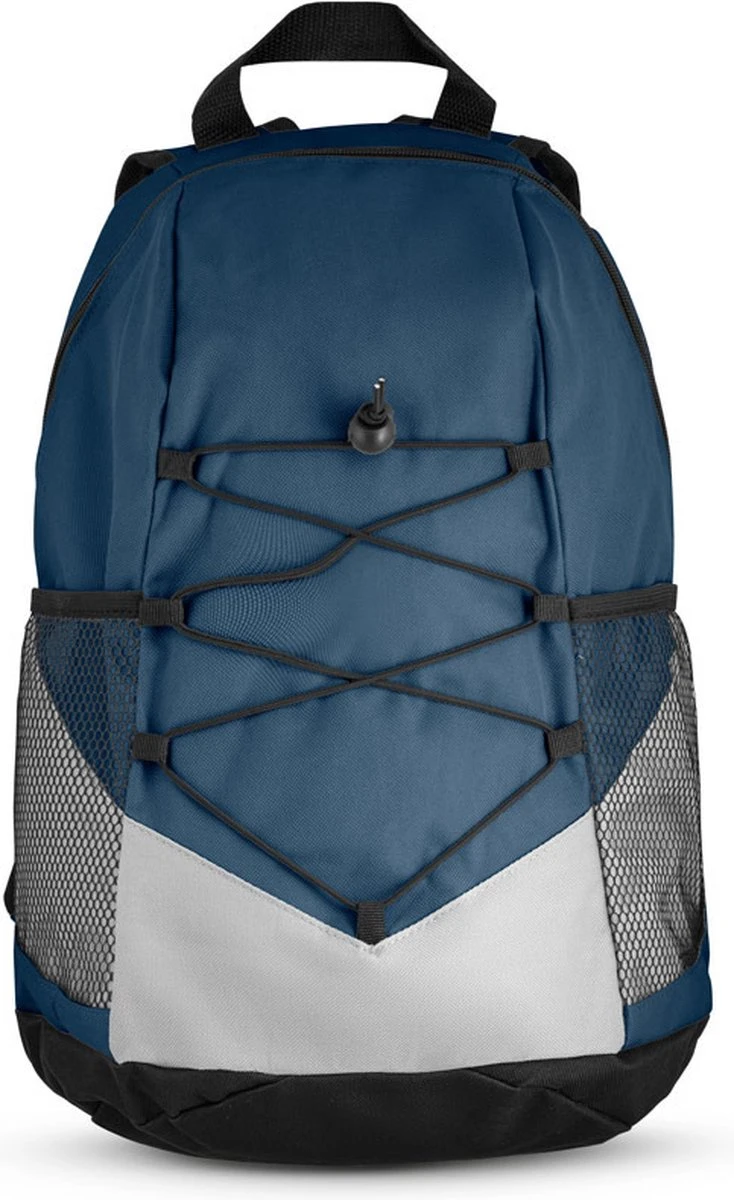 Vrije tijds rugtas/rugzak donkerblauw/wit 42 x 25 x 18 cm. Polyester rugtas met 1 hoofdvak, zijvakken van mesh-stof en gewatteerde achterzijde en schouderbanden. Handig om te wandelen, zwembad, vrije tijd of strand. Gemaakt van polyester.
