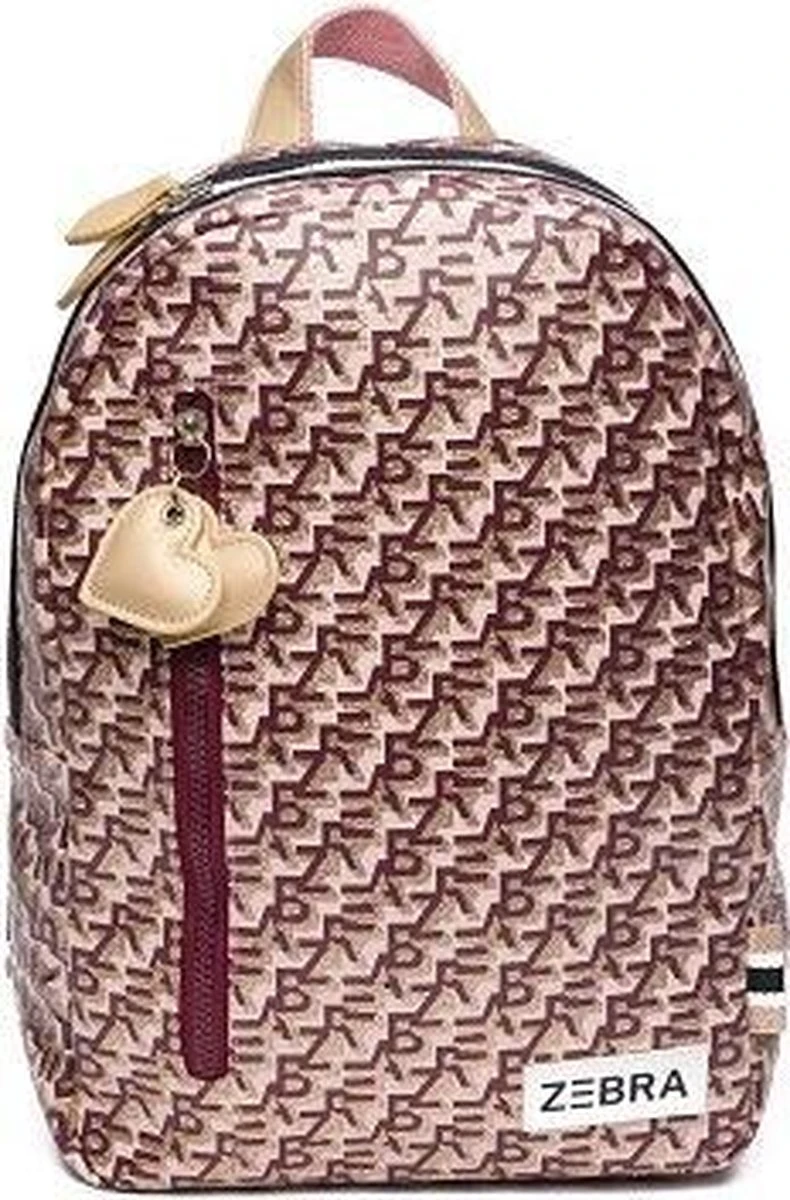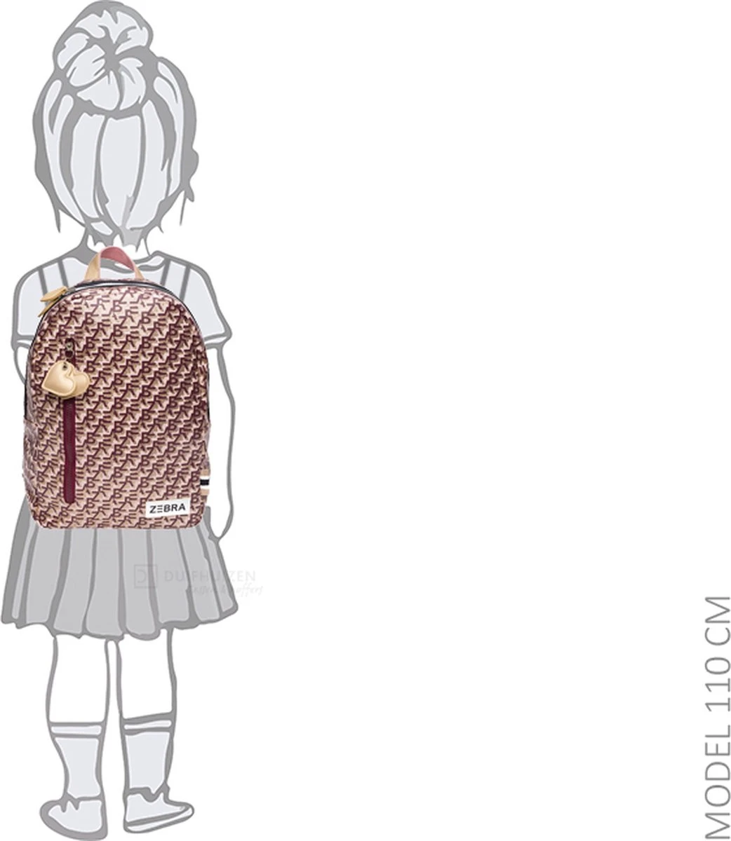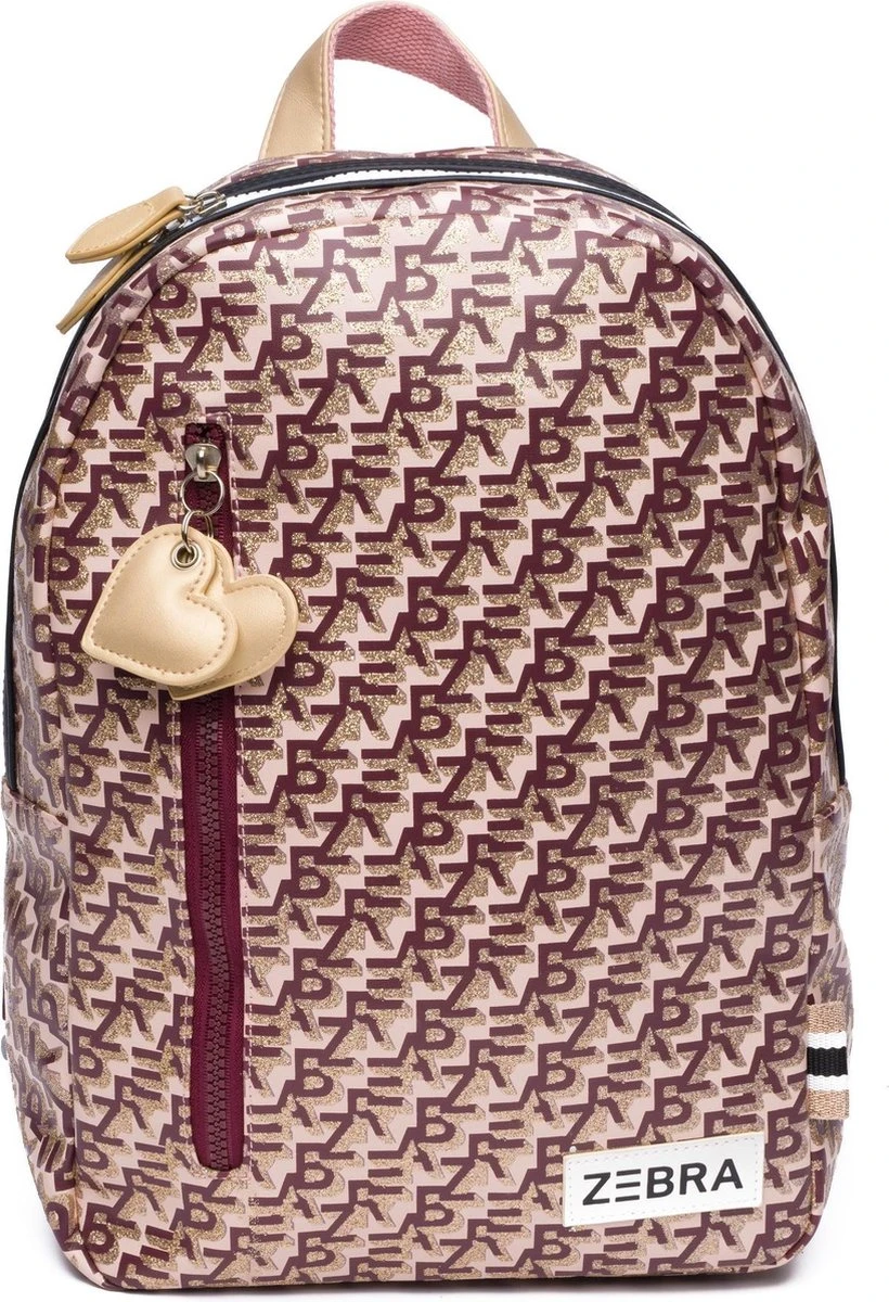 De grotere variant van de originele Zebra logoprint rugzak! Een kleurcombinatie van lichtroze met donkerrood, bewerkt met subtiele gouden glitters. Voorop zit een verticale donkerrode rits afgewerkt met gouden glitterhartjes, die dient als extra opbergvak. De gehele tas heeft een stevige zwart-witte blokrits met dubbele sluiting. De rugzak is te dragen dmv het korte hengsel bovenop en de verstelbare donkerrode kunstleren schouderbanden. Binnenin bevinden zich 2 drinkbekervakken en een vrolijke lichtroze gestreepte voering. Achterop het herkenbare naamlabel.
